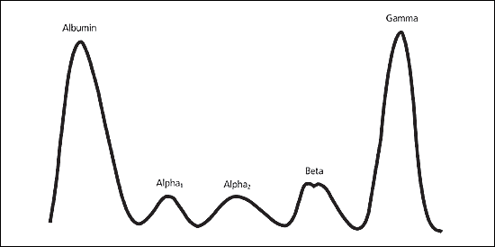 - A homogeneous spike-like peak in a focal region of the gamma-globulin zone indicates a monoclonal gammopathy.