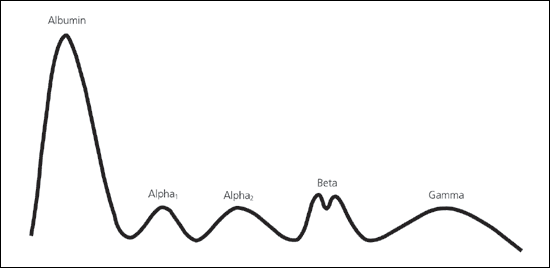 Beta1 is composed mostly of transferrin, and beta2 contains beta-lipoprotein. IgA, IgM, and sometimes IgG, along with complement proteins, also can be identified in the beta fraction.